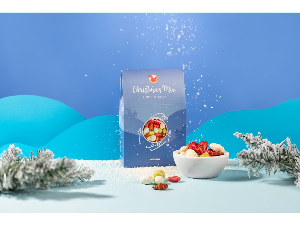 Un amestec exclusiv de nuci: migdale cu caramel, migdale cu cocos, matcha verde și caju cu zmeură – ca o mică delicatesă sub bradul de Crăciun. 🎄