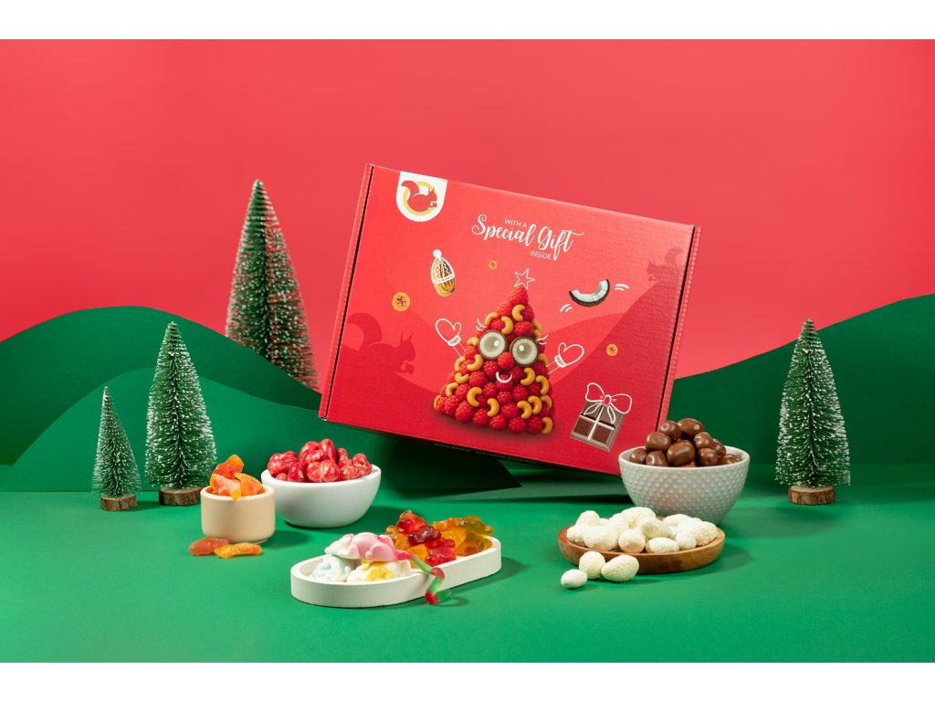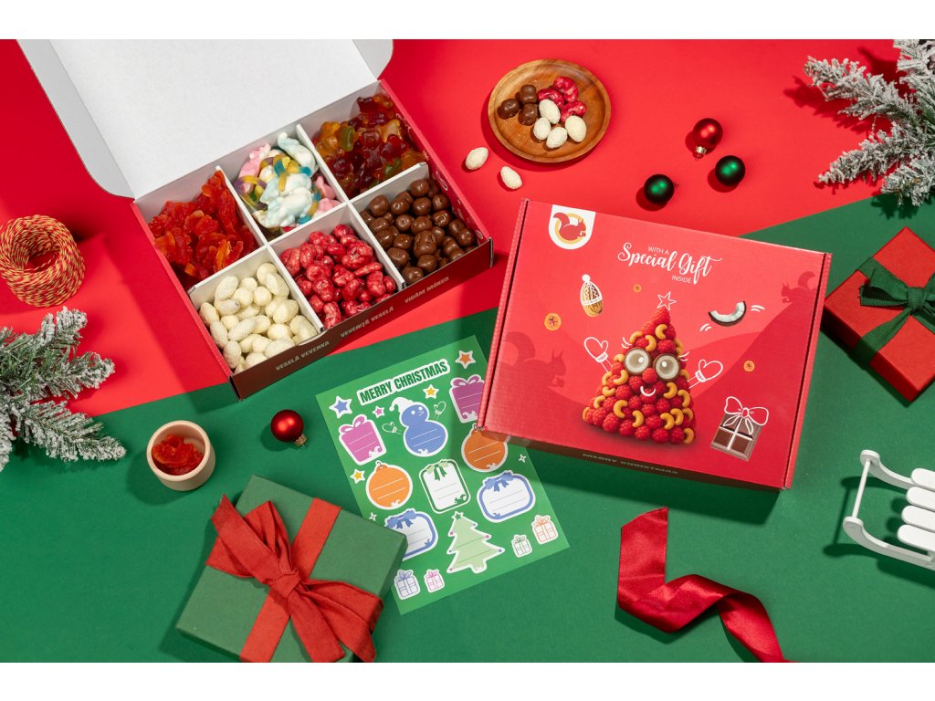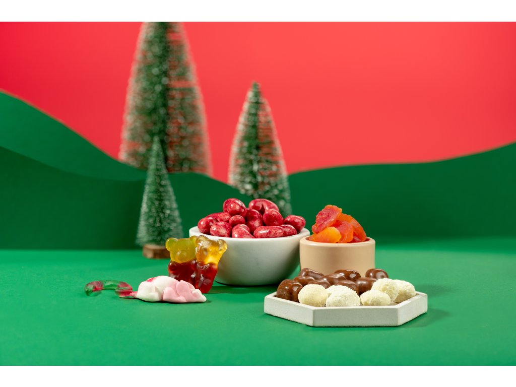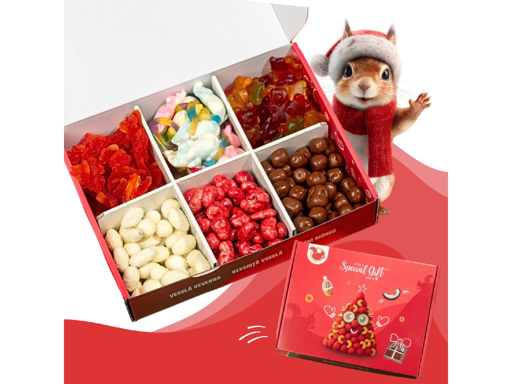 | Sloení: | Fructe (papaya, zmeură, suc de struguri), NUCI (MIGDALE 24%, CAJU 25%), nucă de cocos (15%, cuburi de nucă de cocos), ciocolată (albă, lapte; conține LAPTE, SOIA), zahăr, sirop de glucoză, fructoză, maltodextrină, gelatină, acizi (citric, lactic), pectine, sorbitol, conservant (acid sorbic), arome, coloranți (vegetali și naturali), agenți de glazurare (ceară de albine, ceară carnauba, șelac, gumă arabică). |