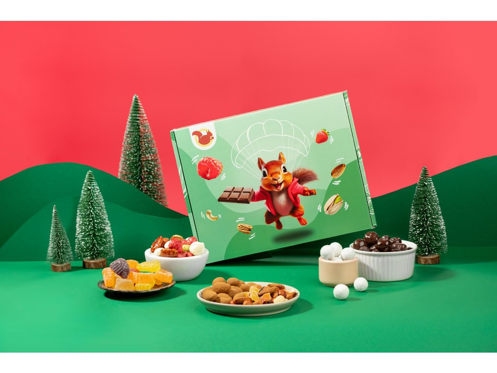 O selecție colorată și veselă de dulciuri festive – nuci crocante, ciocolată și fructe uscate. Tot ce ai nevoie pentru a intra în atmosfera de sărbătoare.